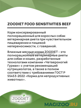 Влажные мясные корма ZOODIET – это полнорационные ветеринарные диеты для собак и кошек, разработанные технологами компании «Четвероногий Гурман» с учетом рекомендаций нутрициологов, а также в полном соответствии с требованиями ГОСТ Р 55453-2022 «Корма для непродуктивных животных».