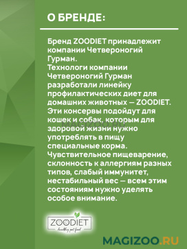 Влажные мясные корма ZOODIET – это полнорационные ветеринарные диеты для собак и кошек, разработанные технологами компании «Четвероногий Гурман» с учетом рекомендаций нутрициологов, а также в полном соответствии с требованиями ГОСТ Р 55453-2022 «Корма для непродуктивных животных».