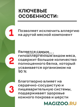 - является самым гипоаллергенным видом мяса, содержит большое количество полноценного белка, который усваивается организмом на 90 %.