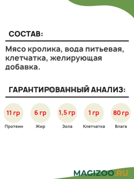 Мясо кролика, вода питьевая, клетчатка, желирующая добавка.