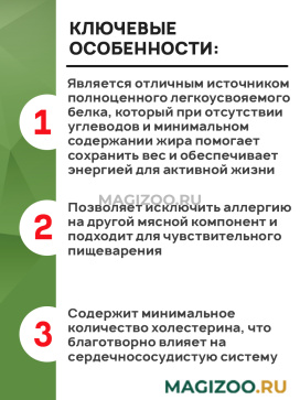 - позволяет исключить аллергию на другой мясной компонент и подходит для чувствительного пищеварения