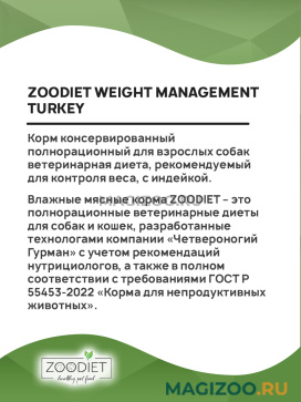 Корм консервированный полнорационный для взрослых собак ветеринарная диета, рекомендуемый для контроля веса, с индейкой.