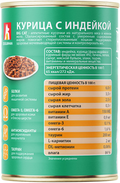 Состав: индейка, курица (фарш индейки и куриный фарш не менее 4%), печень, легкое, сычуг, мясной бульон, злаки, таурин, витамины и минеральные вещества.