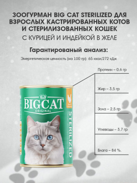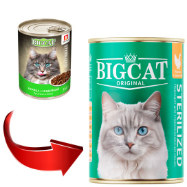 BIG CAT - влажный корм для кошек на основе натурального мяса. Нежные аппетитные кусочки в желе придутся по вкусу самым требовательным персонам.