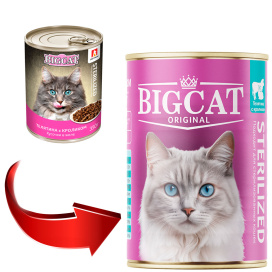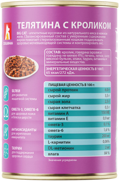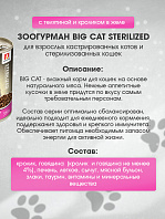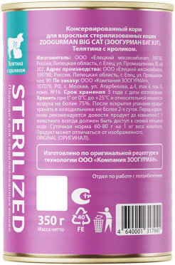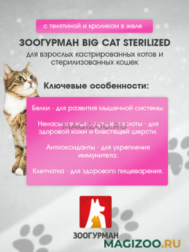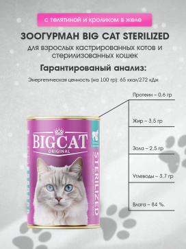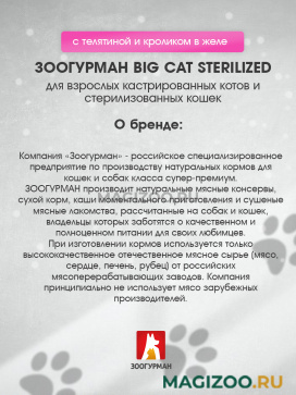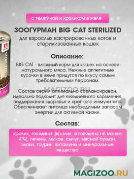 Влажный корм (консервы) ЗООГУРМАН BIG CAT STERILIZED для взрослых кастрированных котов и стерилизованных кошек с телятиной и кроликом в желе (350 гр)