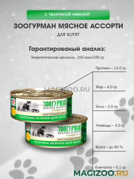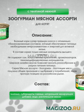 Информация о составе и ингредиентах, цветовом решении, технических и иных характеристиках, стране-изготовителе, внешнем виде и комплекте поставки товара носит справочный характер и основана на последних доступных к моменту публикации сведениях. Доставка данного товара осуществляется во все регионы РФ.ЗООГУРМАН производит натуральные мясные консервы, сухой корм, каши моментального приготовления и сушеные мясные лакомства, рассчитанные на собак и кошек, владельцы которых заботятся о качественном и полноценном питании для своих любимцев.