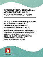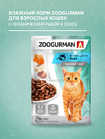 Полнорационный консервированный корм для взрослых кошек с океанической рыбой в виде аппетитных кусочков в соусе.