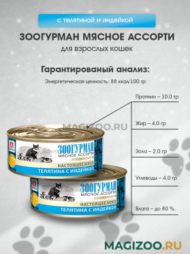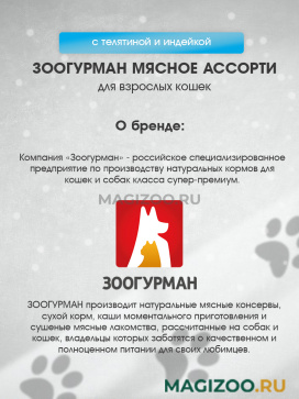 Информация о составе и ингредиентах, цветовом решении, технических и иных характеристиках, стране-изготовителе, внешнем виде и комплекте поставки товара носит справочный характер и основана на последних доступных к моменту публикации сведениях. Доставка данного товара осуществляется во все регионы РФ.ЗООГУРМАН производит натуральные мясные консервы, сухой корм, каши моментального приготовления и сушеные мясные лакомства, рассчитанные на собак и кошек, владельцы которых заботятся о качественном и полноценном питании для своих любимцев.