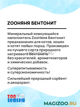 Минеральный комкующийся наполнитель ZooНяня Бентонит предназначен для котов, кошек и котят любых пород. Произведен из лучшего сорта природного натриевого бентонита без красителей, ароматизаторов и химических добавок.