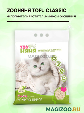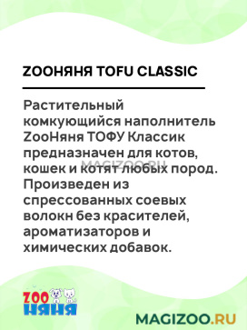 Растительный комкующийся наполнитель ZooНяня ТОФУ Классик предназначен для котов, кошек и котят любых пород. Произведен из спрессованных соевых волокн без красителей, ароматизаторов и химических добавок.