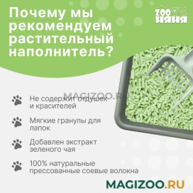 Растительный комкующийся наполнитель ZooНяня ТОФУ Зеленый чай предназначен для котов, кошек и котят любых пород. Произведен из спрессованных соевых волокн без красителей, ароматизаторов и химических добавок.