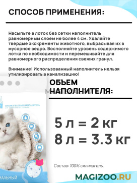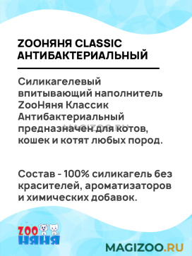 Силикагелевый впитывающий наполнитель ZooНяня Классик Антибактериальный предназначен для котов, кошек и котят любых пород.
