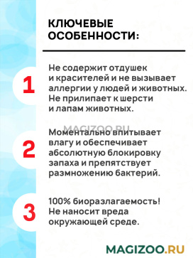 - Моментально впитывает влагу и обеспечивает абсолютную блокировку запаха и препятствует размножению бактерий.