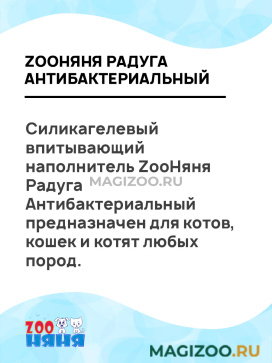 Силикагелевый впитывающий наполнитель ZooНяня Радуга Антибактериальный предназначен для котов, кошек и котят любых пород.