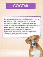 Состав: мясо и субпродукты не менее - 80% (в том числе индейка - минимум 15%), бульон, клетчатка.