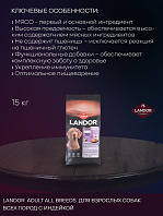 Торговая марка Landor выпускает сухие корма для собак всех породных и размерных категорий, а также ряд полнорационных влажных кормов для собак различных возрастных групп и лакомства для собак.