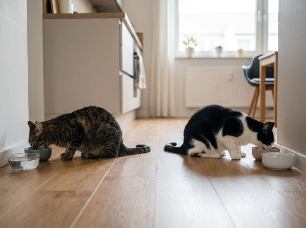 Кошки едят из всех мисок сразу. При необходимости кормите их в разных помещениях.