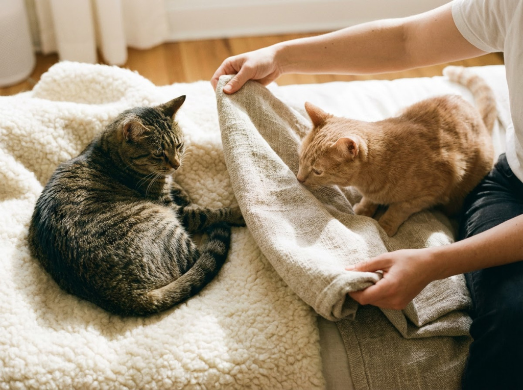 - Накинуть на драчунов легкое покрывало или полотенце. Животные замрут. Тогда можно завернуть новичка и унести.