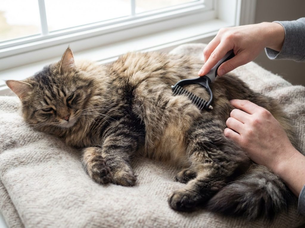 В конце питомца нужно вычесать кошачьей расческой или щеткой-пуходеркой. Это поможет удалить остатки волосков, застрявших в шерсти. При многочисленных комках удаление лучше проводить поэтапно.