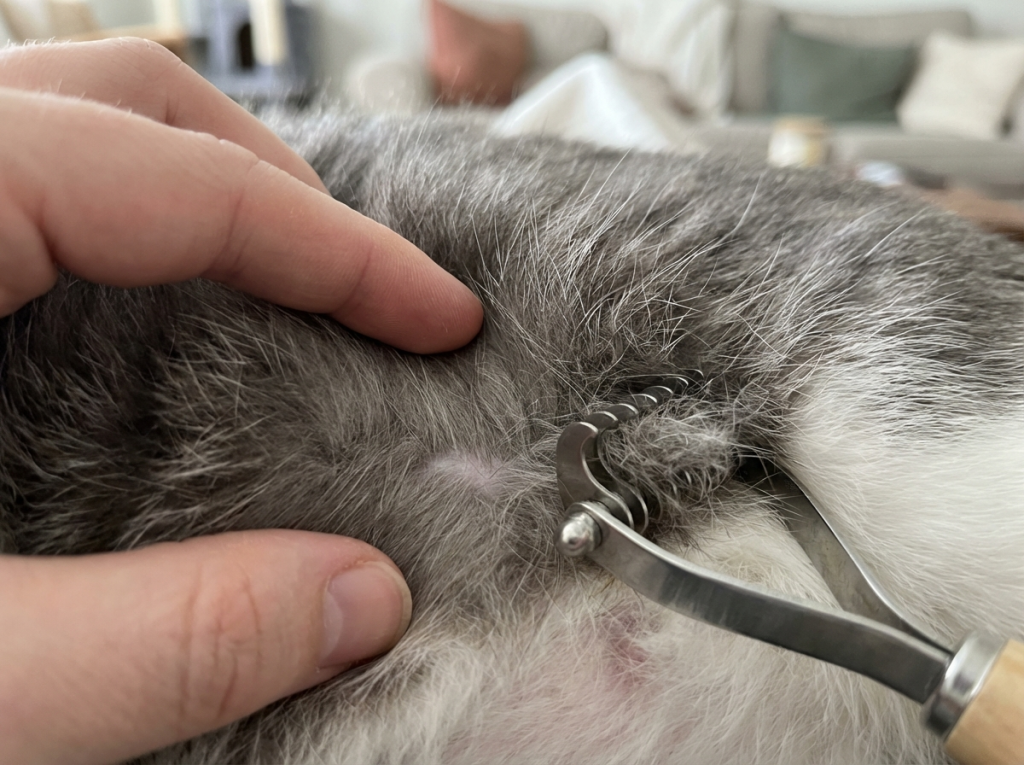 - Стараясь избавиться от шерстяного комка самостоятельно, животное царапает кожу. В открытую ранку проникает инфекция, в результате чего на теле появляются локальные нагноения.