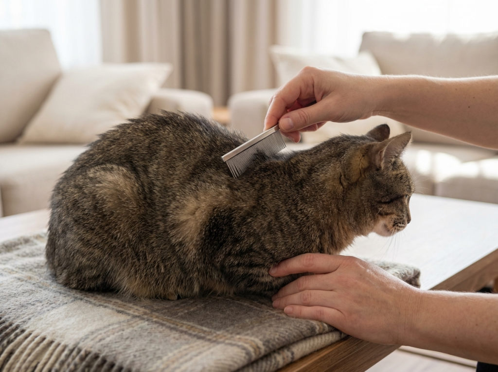 - После купания заверните кошку в полотенце, просушите шерсть, расчешите расческой с мелкими зубьями, удалите насекомых и их яйца.