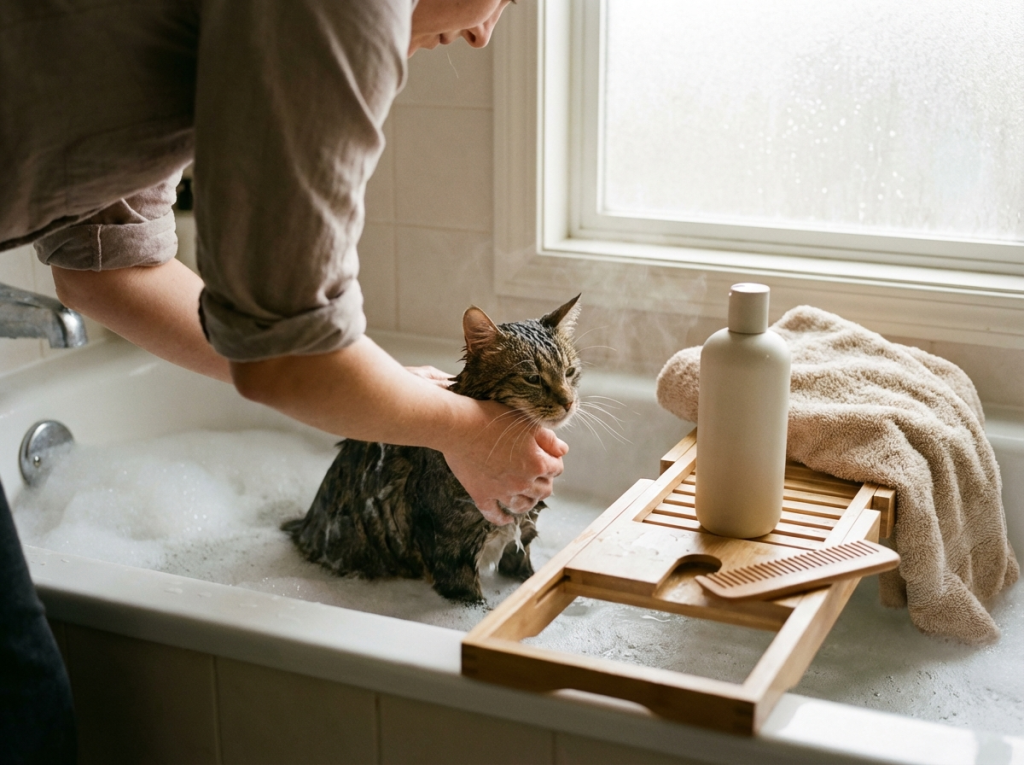 При использовании противоблошиных моющих средств нужно купать кота, следуя рекомендациям производителя.