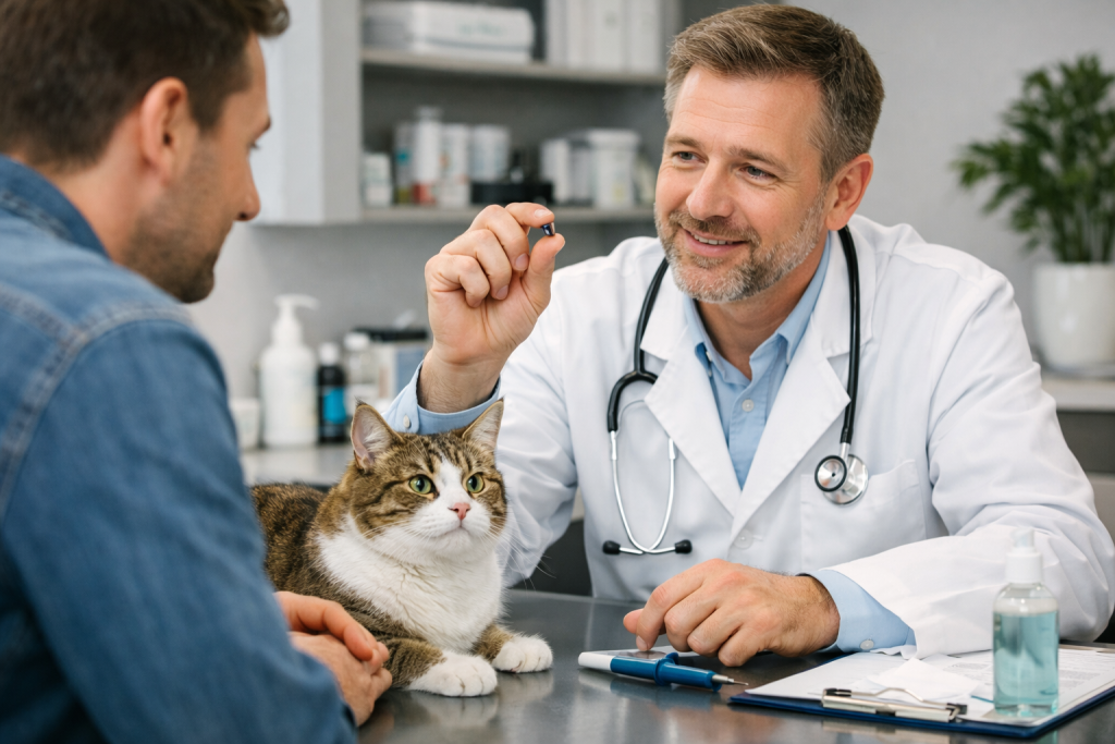 - Ветеринар сканирует чип и сравнивает отобразившийся номер с тем, что указан на наклейке.