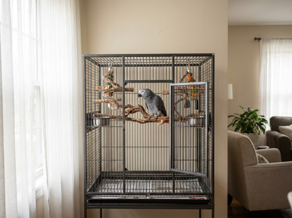 Дом для попугая должен быть безопасным, поэтому выбираем традиционную клетку из нержавеющей стали с хромированием или никелированием.
