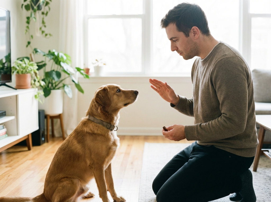 - обучить питомца командам «голос», «тихо»;