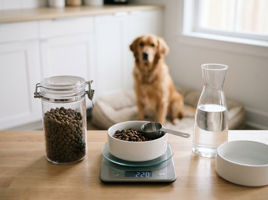 Натуральная еда содержит до 80% воды, а гранулы – 10%. Съедая килограмм натуралки, животное получает 200 грамм сухих питательных веществ, при поедании 1 кг обезвоженных крекеров в организм попадает 900 грамм. Сделайте расчеты по этой формуле с учетом веса собаки и потребности в пище, чтобы каждый день переходного периода она получала достаточно питательных веществ.