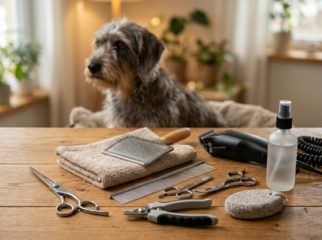 Для ухода за жесткой шерстью нужно использовать несколько разных расчесок. Для расчесывания шерстяного покрова на голове и лапах используют металлический гребень с редкими зубьями. Им расчесывают собаку перед триммингом и после него. Редкие зубья аккуратно удаляют шерстинки, не выдергивая и не травмируя живую шерсть, не причиняя боли животному. Такую расческу удобно использовать и для распутывания колтунов.